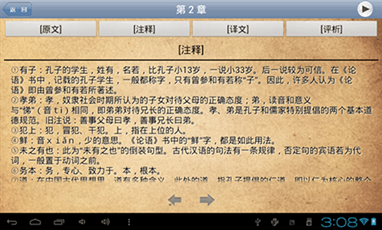 点击靠上方四个按钮分别显示对应的“原文”、“注释”、“译文”和“评析”内容,点击屏幕下方中间左右箭头按钮可进行内容翻页,点击屏幕右上角